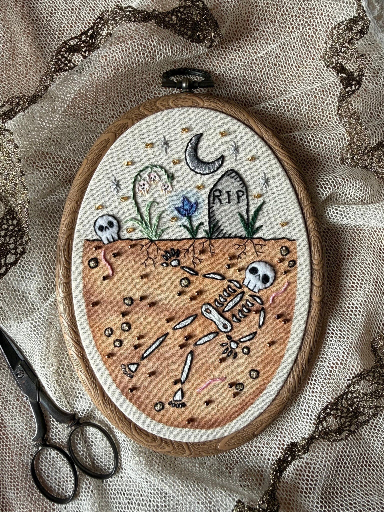 Hand embroidered Sleeping Cemetery design, depicting a skeleton resting beneath a grave stone & flowers, underneath the night sky. Embellished with watercolour paint, metallic threads, felt & beads.
