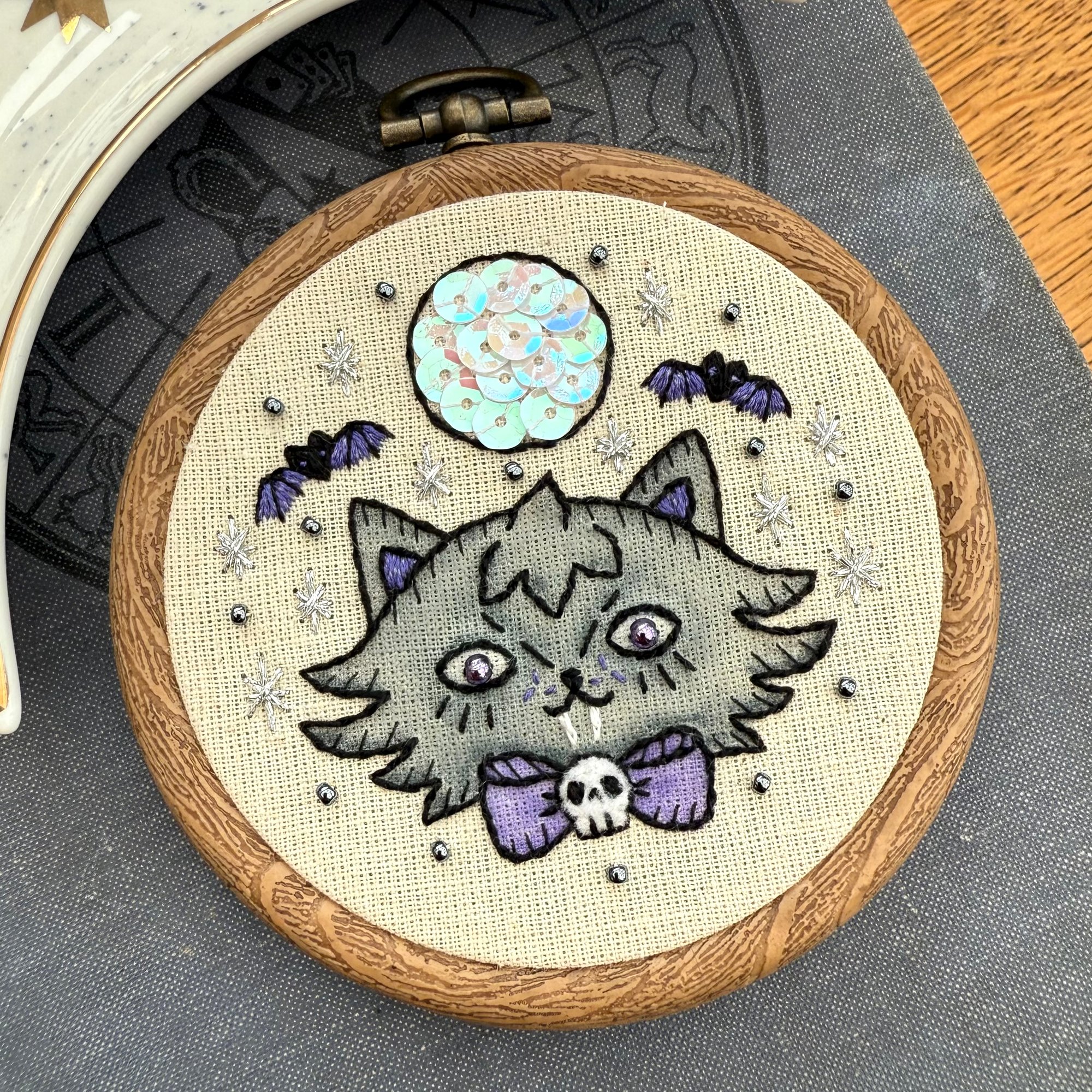Hand embroidered Were-Kitty design. Embellished with metallic threads, felt, beads & sequins.